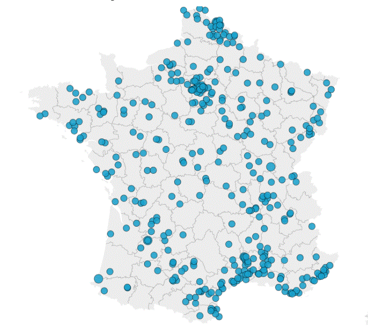 Chaque cercle représente une commune française où l’un de ces hommages a été officialisé.