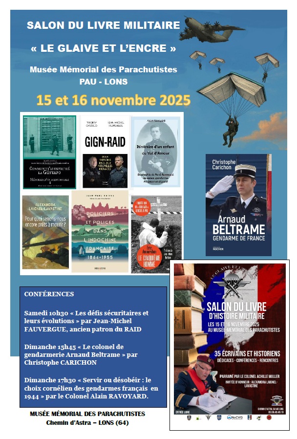 Christophe Carichon, auteur d’ « Arnaud Beltrame, gendarme de France », tiendra une conférence exceptionnelle sur Arnaud Beltrame le dimanche 16 novembre 2025 15h45 au musée mémorial des parachutistes de Pau-Lons, à l’occasion du salon du livre militaire “Le glaive et l’encre”.